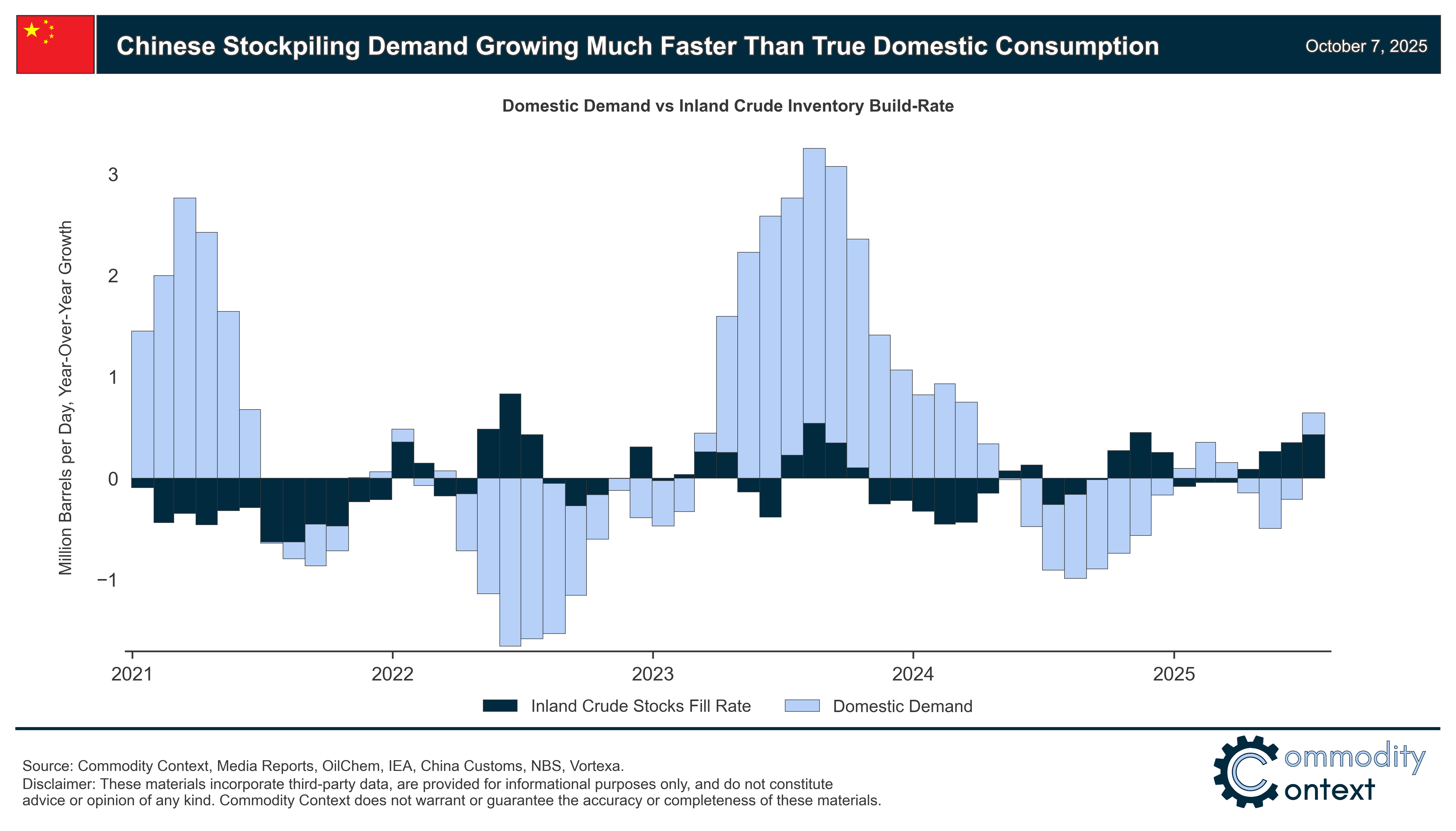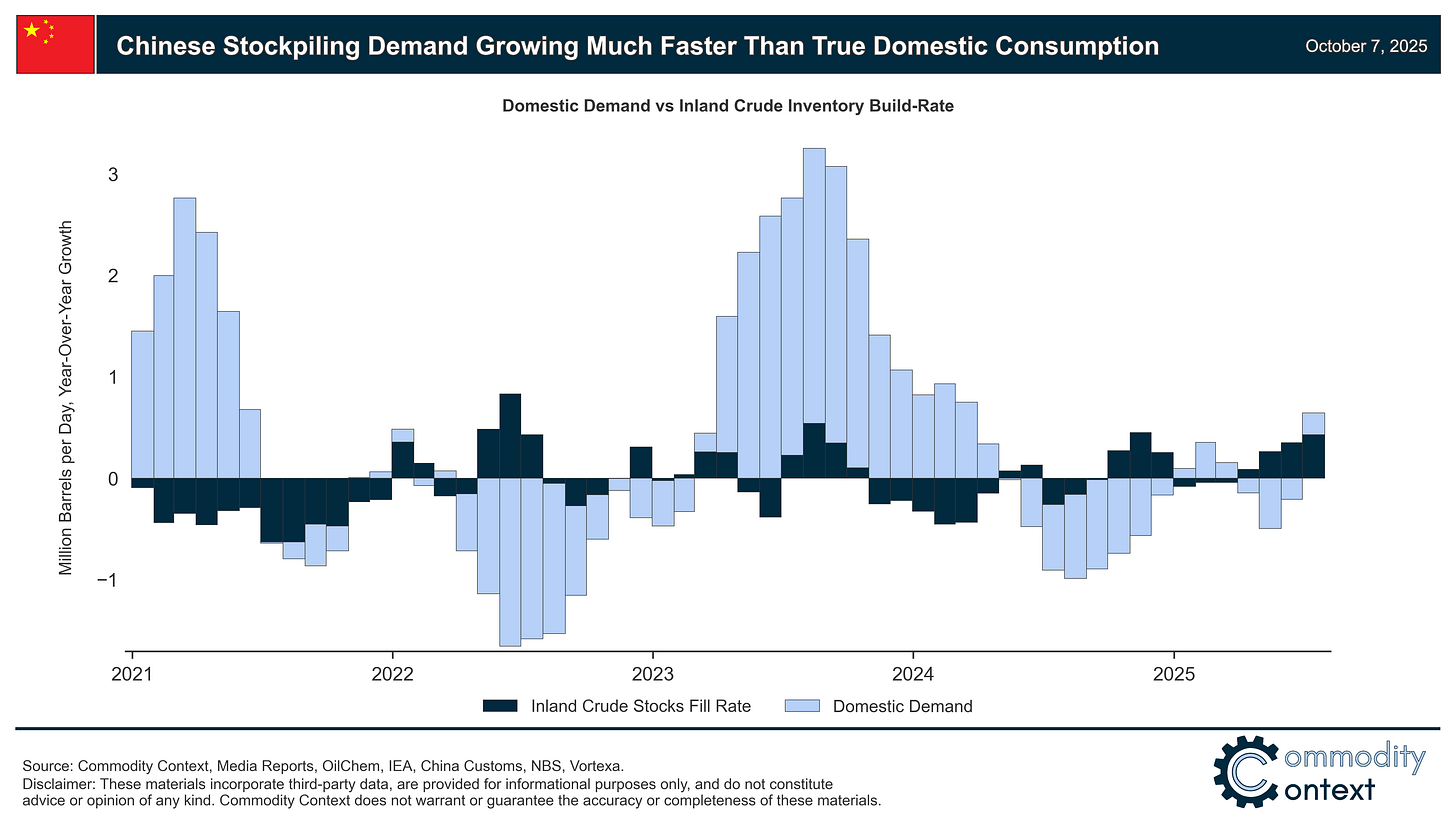 The entirety of effective Chinese demand stimulus over the past year has been demonstrably driven by stock-building (and not domestic consumption), which vacuumed up nearly 1 MMbpd, on average, through the second quarter of 2025.
