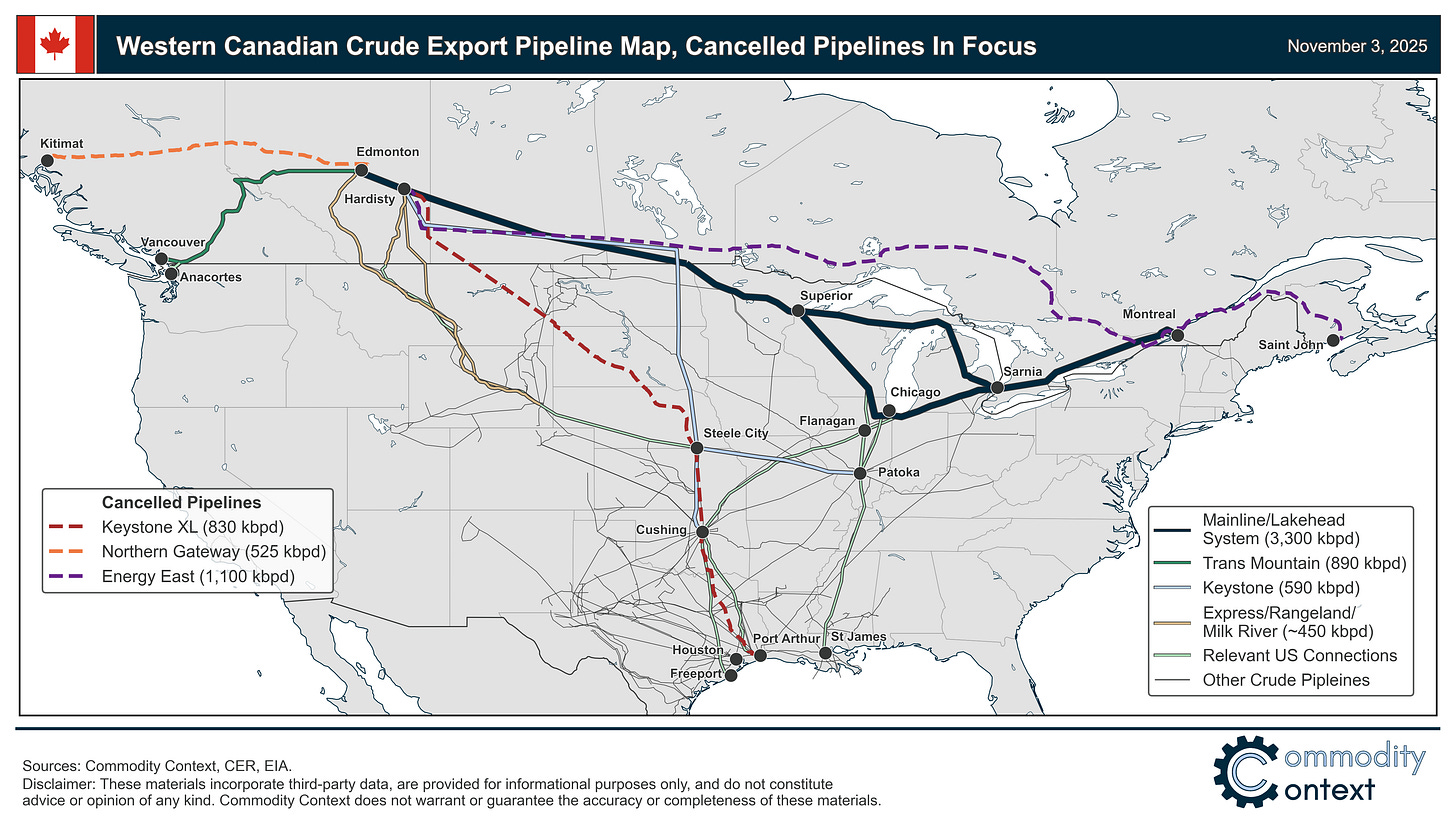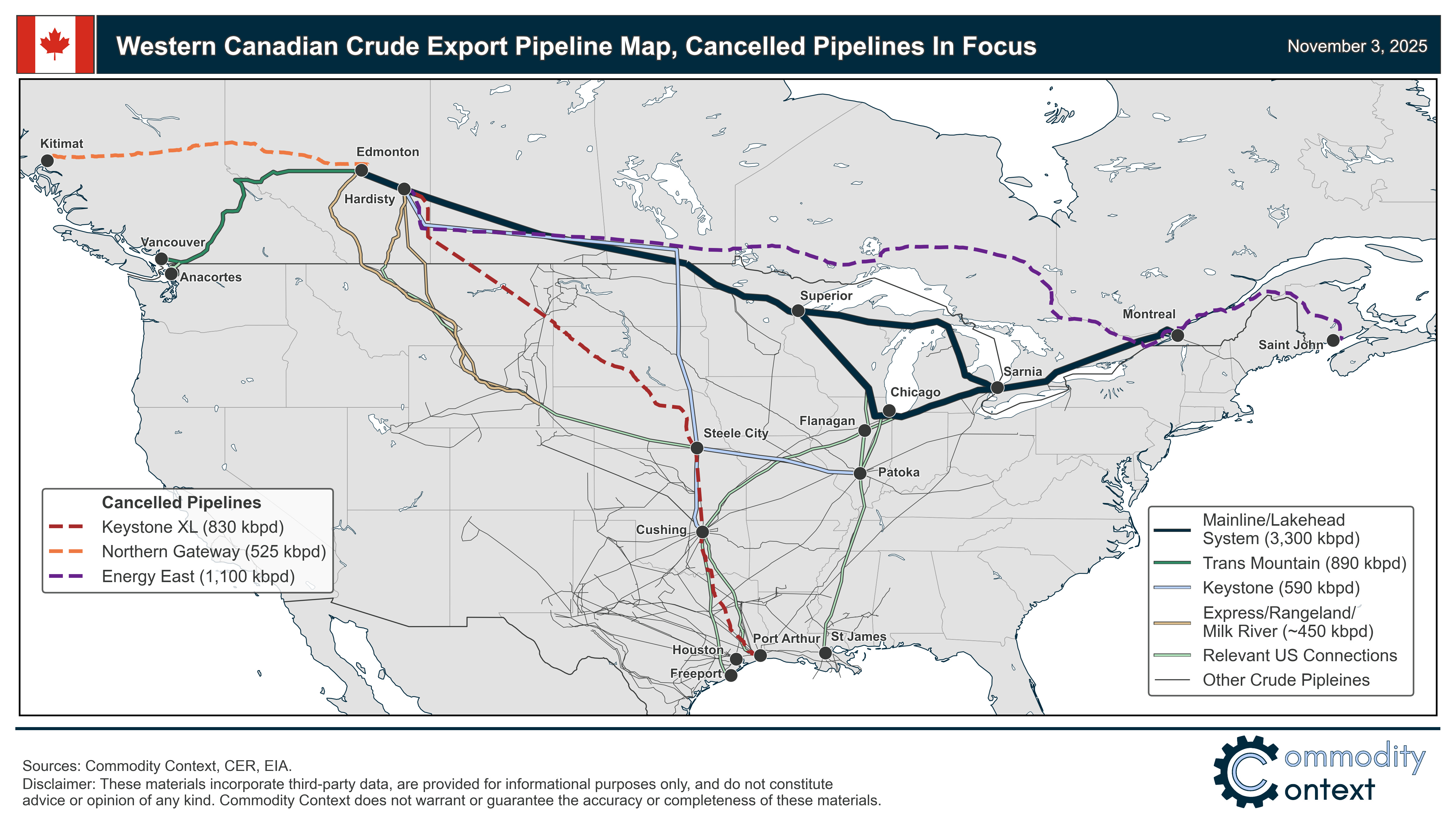 In the spirit of Halloween, the “zombie pipeline”, Keystone XL, has, once again, been making headlines. The subject of recent industry journalist enquiries, Keystone XL is likely the North American pipeline with the greatest name recognition—especially strange since it doesn’t actually exist. The proposed pipeline was cancelled by Obama in 2015, reincarnated by Trump in 2017, killed again in 2021 by Biden, and there is now talk between Trump and Canadian PM Carney of trying to build the pipeline once more. Keystone XL would shuttle western Canadian heavy crude toward the US Gulf Coast; but, the project has faced (arguably, kickstarted) the now commonplace practice of environmental groups targeting midstream projects as a means of opposing upstream oilsands development.