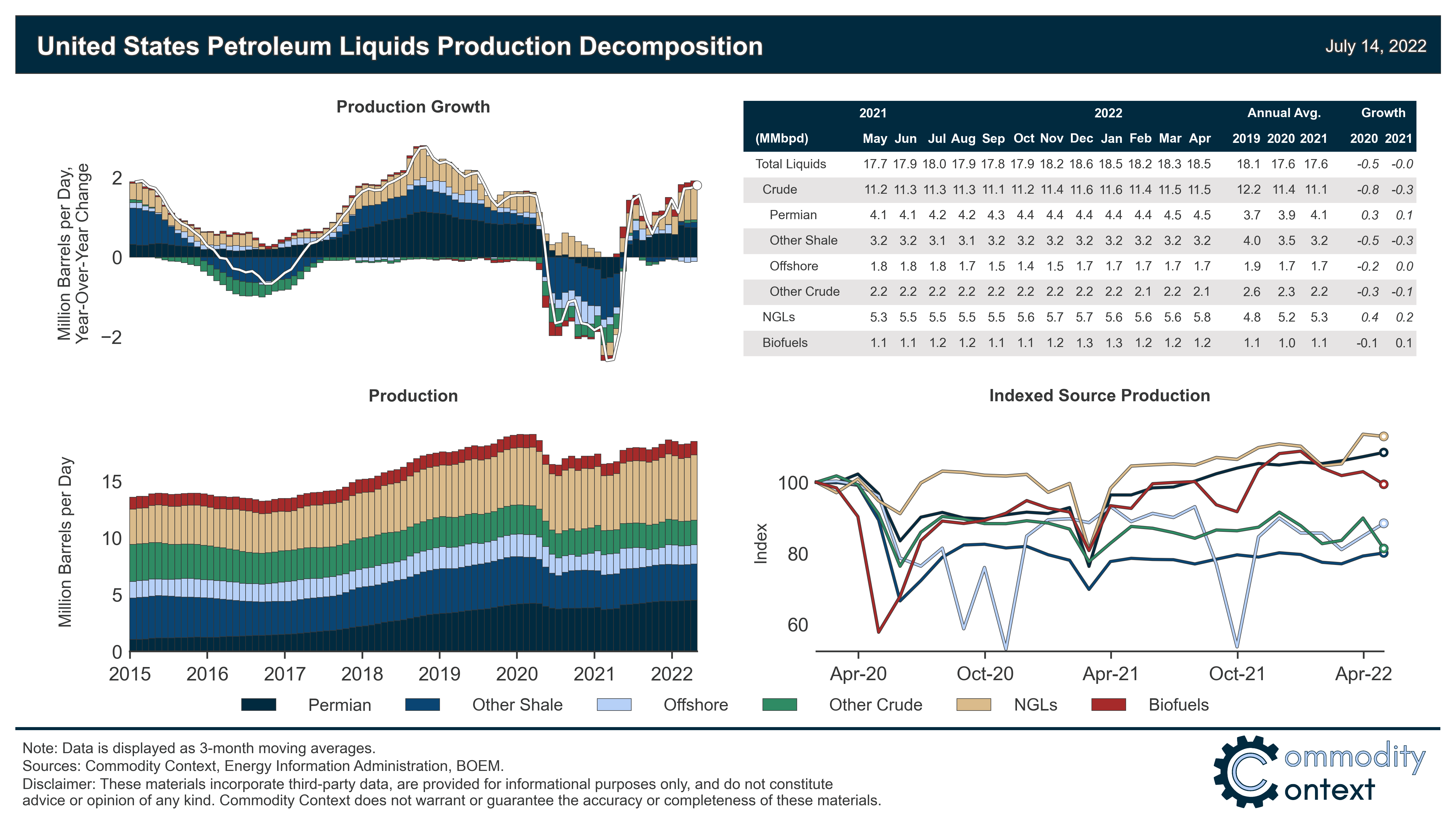 While US crude production remains more than a million barrels per day below pre-COVID levels, total liquids supply has recovered much quicker thanks to continued growth in NGLs and biofuels.