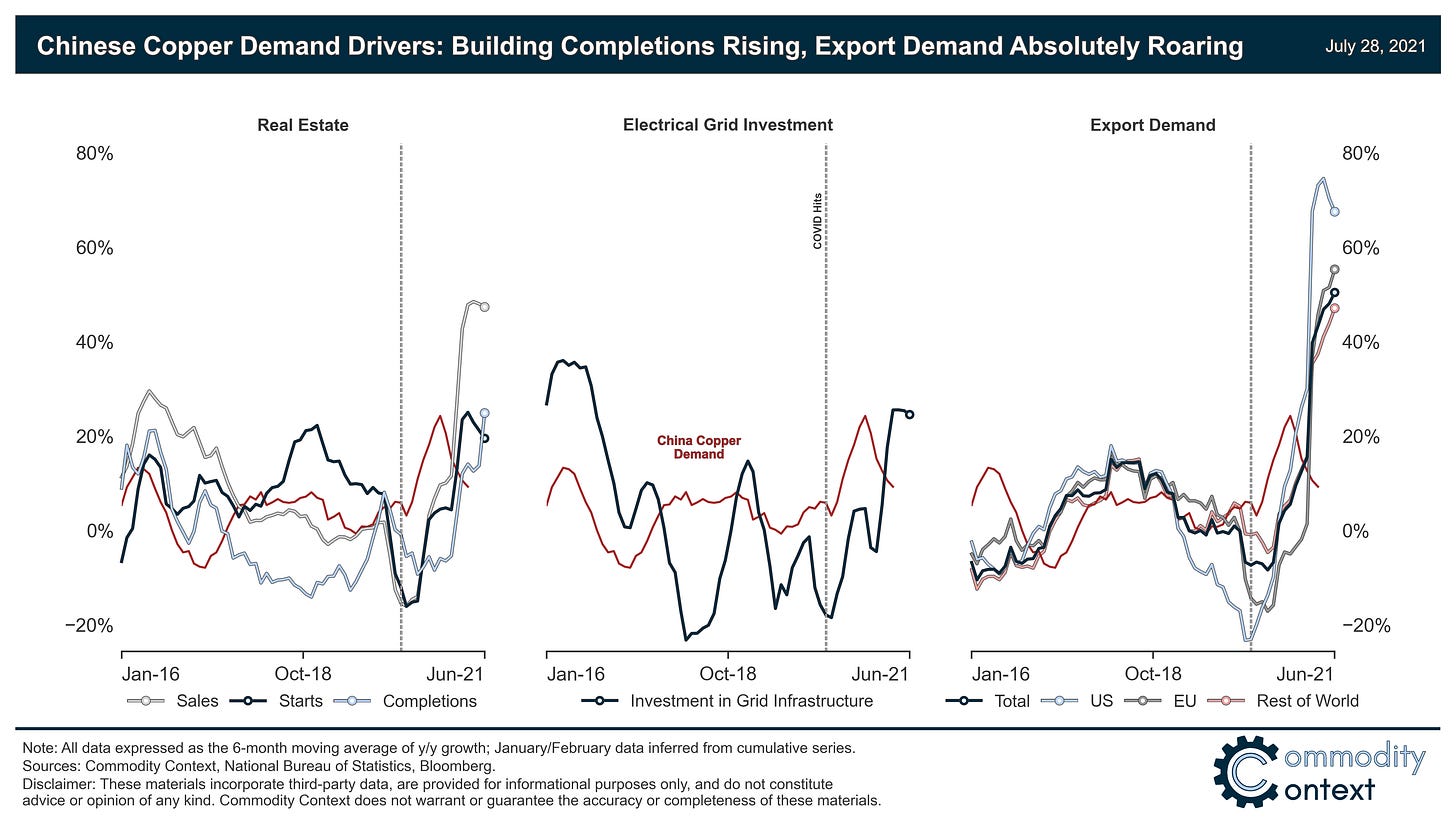 Chinese copper demand can be broadly broken down into four broad buckets: real estate construction, electrical grid investment, export demand, and strategic inventories. As can be seen in the chart above, China’s apparent demand for copper boomed before its three more-visible copper-intensive industries even got off the starting line, meaning the consumption jolt likely began as an opportunistic accumulation of strategic stockpiles at a time of pandemic-depressed pricing.