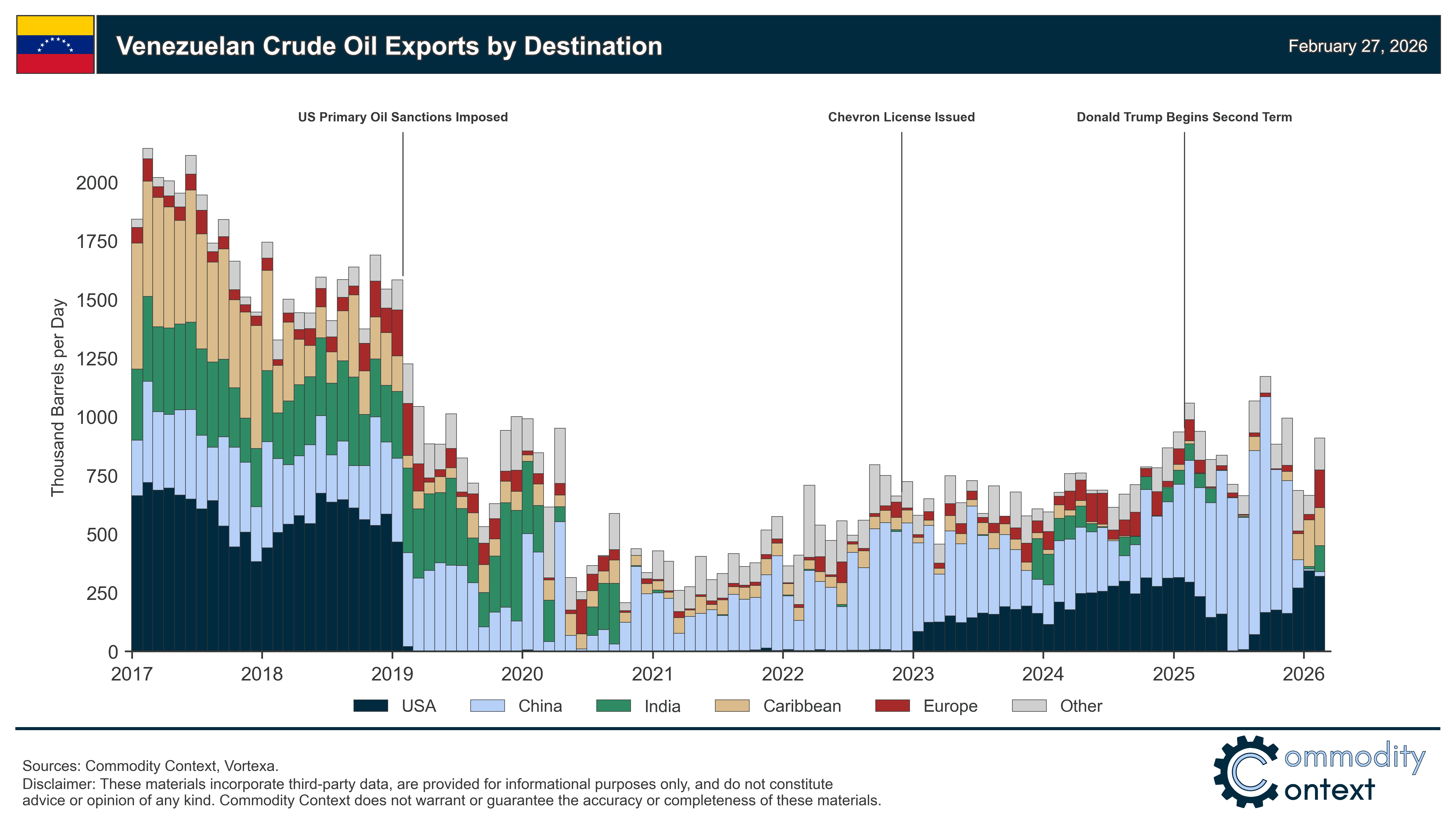 Historically, the US has served as the largest market for Venezuelan heavy crude, alongside China, India, and the Caribbean, and the bulk of post-Maduro shipments have been routed to the US Gulf Coast.