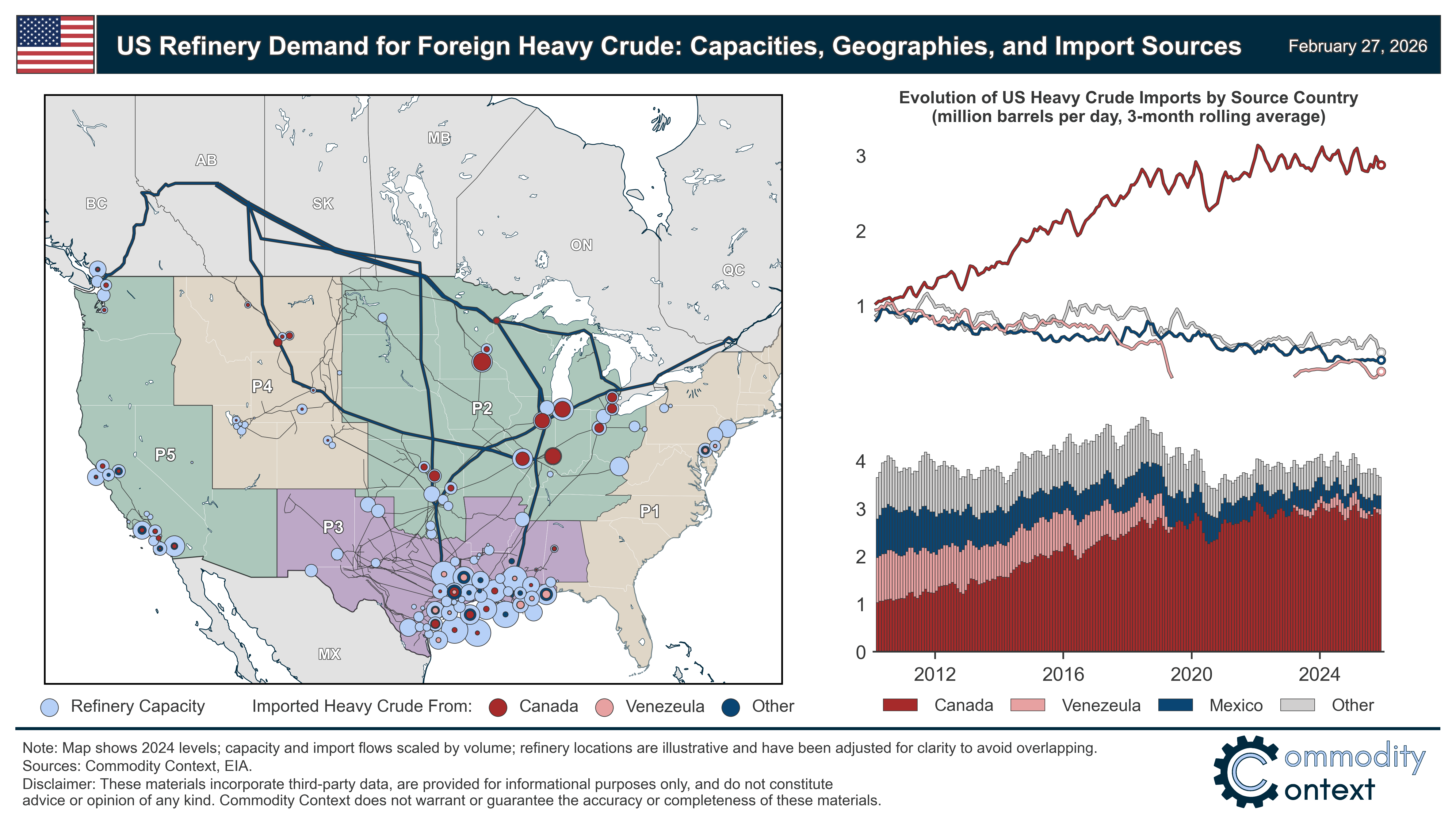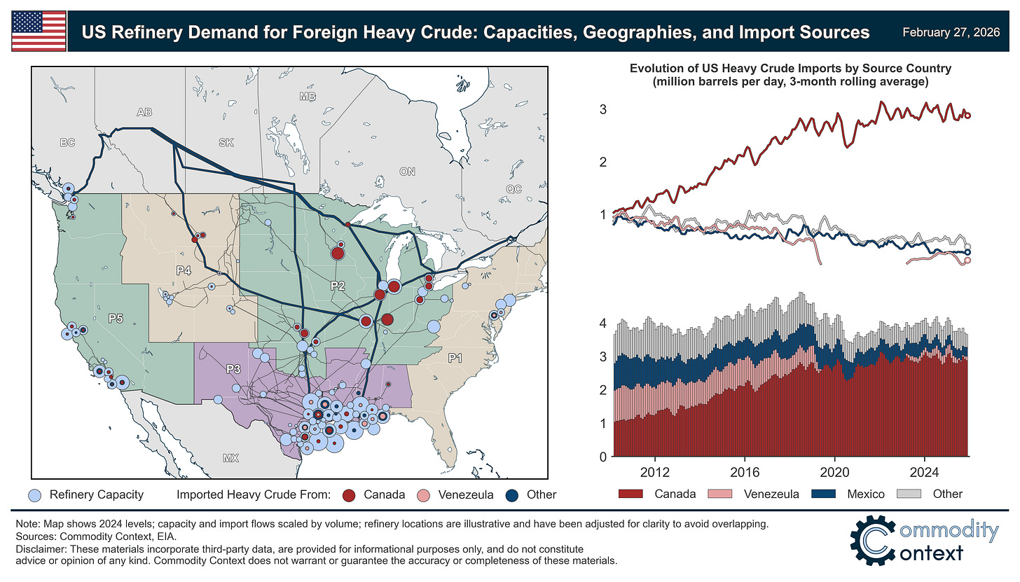 The amount of displaced non-Venezuelan heavy crude—from Canada, Mexico, Colombia, and others—is, therefore, likely somewhere in the low hundreds of kbpd.
