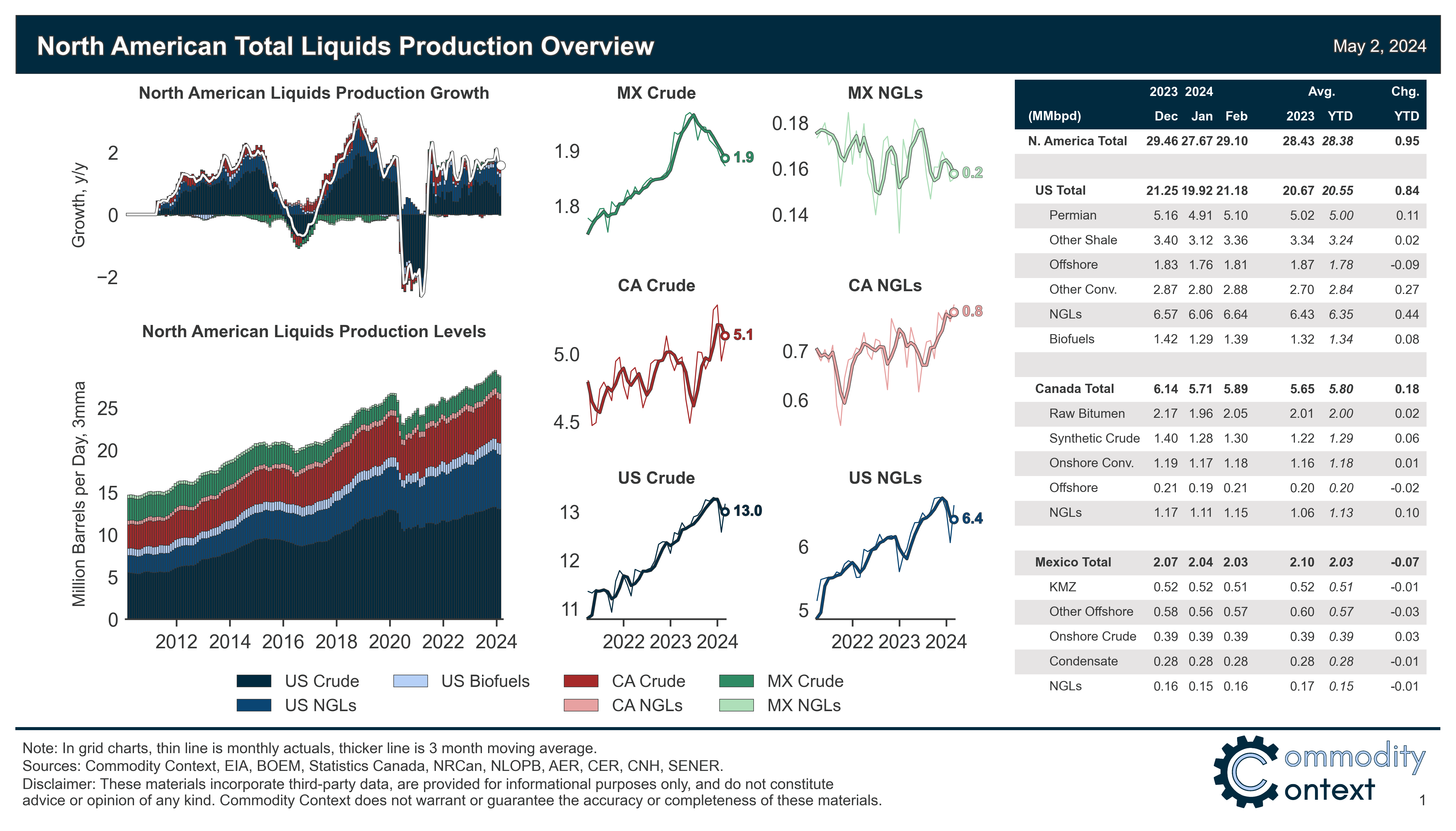 This 35-page May 2024 edition of my monthly data-dense and visualization-heavy North American Oil Data Deck (attached PDF below paywall) is exclusive to paid Commodity Context subscribers. The deck contains detailed, decomposed accounting for US, Canadian, and Mexican upstream (i.e., production), downstream (i.e., refining) oil activity, and end-user demand.