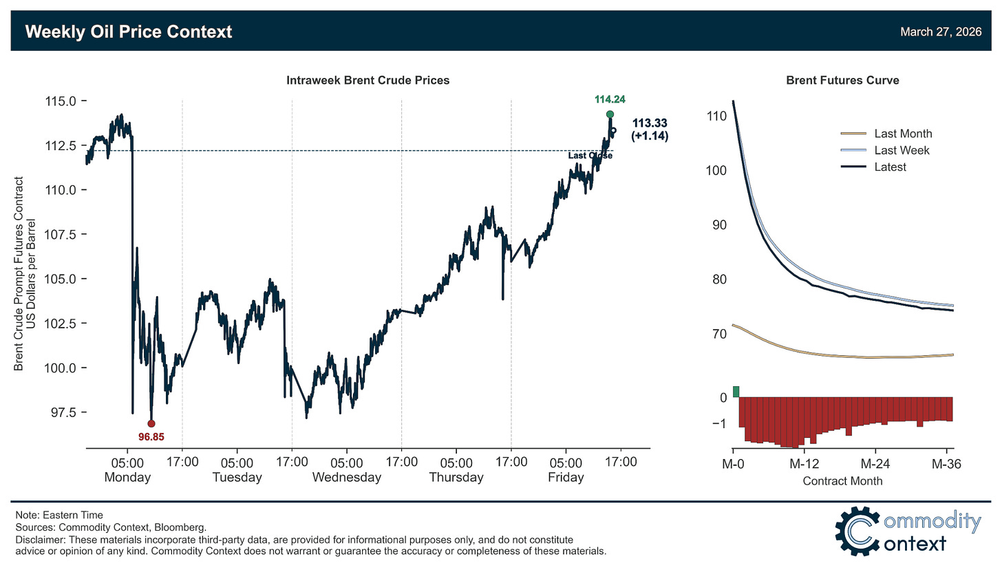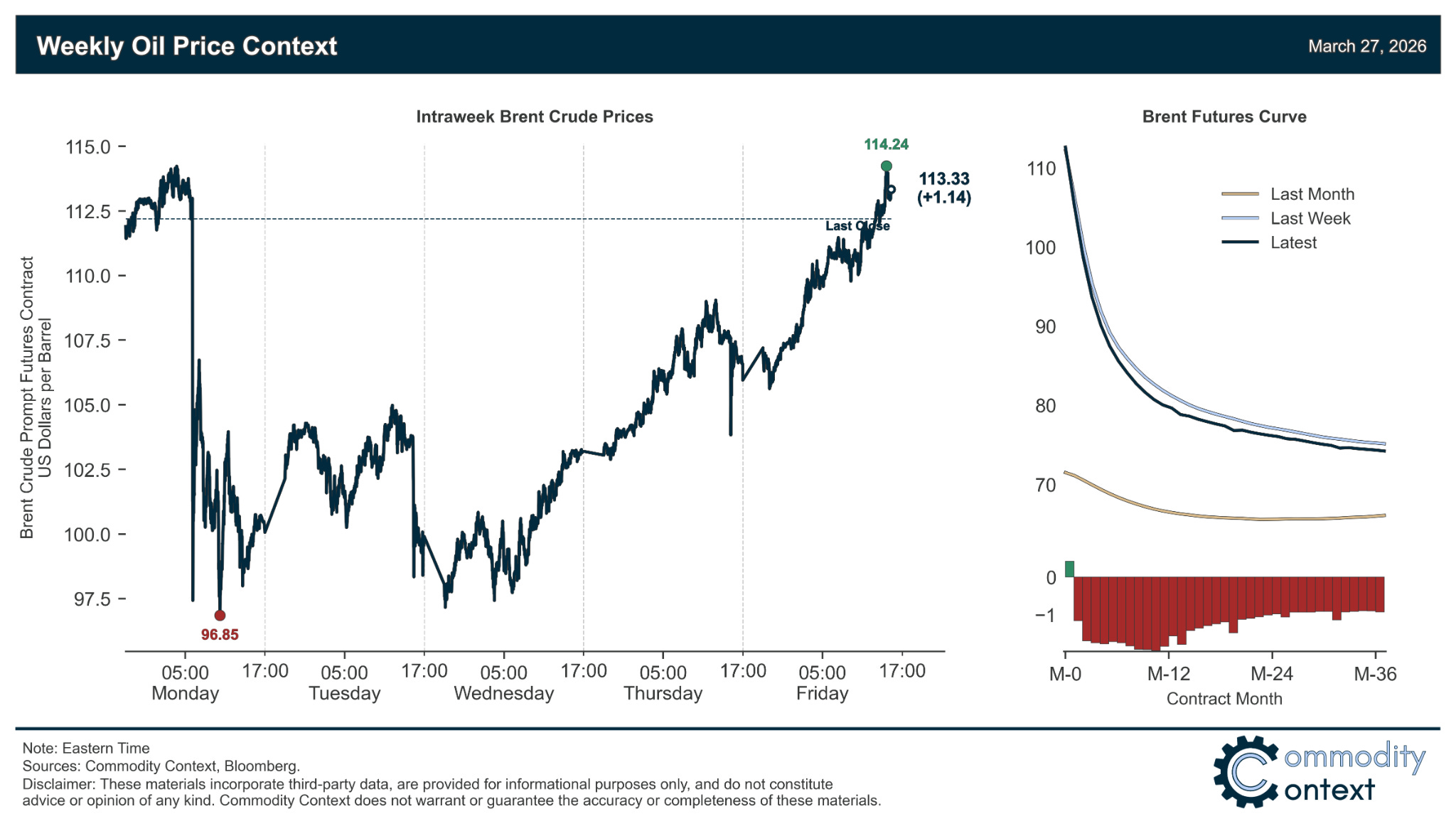 Flat Prices rose modestly, ending the week just more than $1/bbl higher than last Friday’s close, but that small w/w change masked considerable volatility over the course of the week, with crude collapsing more than $15/bbl on Monday following a de-escalatory post from President Trump, before prices continued to grind their way higher again on the lack of any firm progress on reopening the Strait of Hormuz.