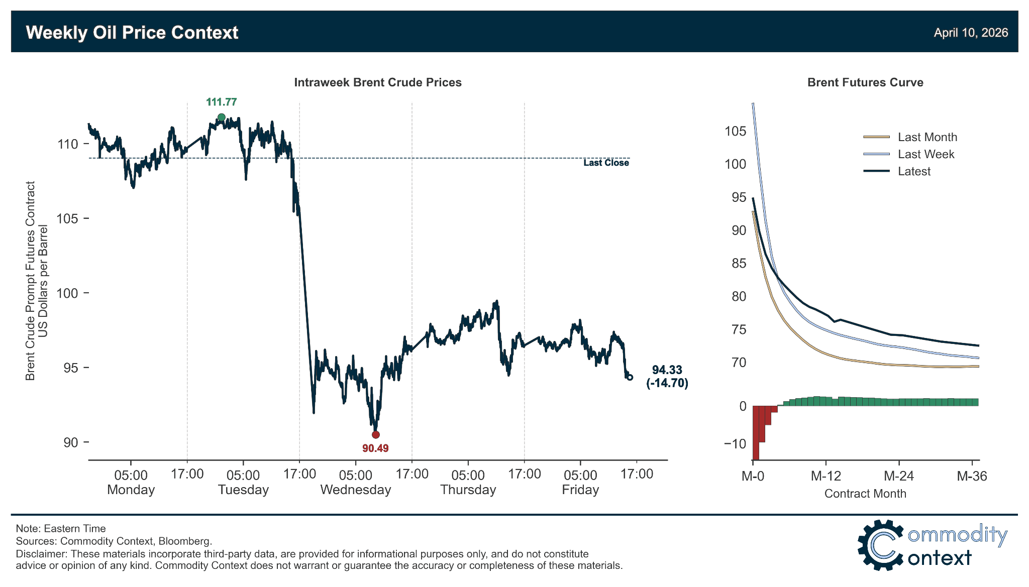 Flat Prices collapsed by more than $14/bbl following the ceasefire announcement, marking the largest weekly decline since the start of the Iran War; Brent prompt futures (June delivery) are now sitting around $97/bbl while Dated Brent (spot) prices are sitting around $130/bbl after reaching an all-time high of $144.46/bbl on Tuesday, which outstripped the prior [nominal] all-time high set in 2008.