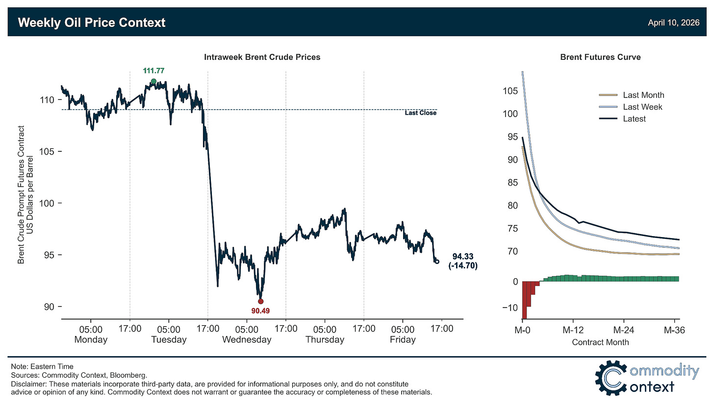 Market Positioning data revealed that speculators were small net sellers of crude futures and options contracts through Tuesday, though the sharp retracement of prices following the ceasefire—announced immediately after the end of the Commitments of Traders survey window—likely represents a considerable liquidation of what was excess speculative length.