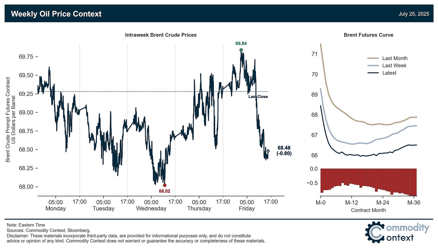 Flat Prices eased modestly, falling less than $1/bbl to around $68/bbl (Brent) through a relatively quiet week, with weaker term structure validating the prompt price softening.