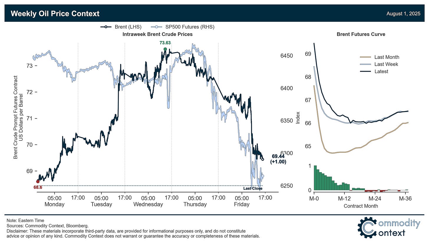 Flat Prices rallied through the first half of the week on renewed sanctions risks before pulling back on Thursday and collapsing, alongside a broader rout in risk assets, on Friday following a torrent of tariff announcements and terrible US jobs data.