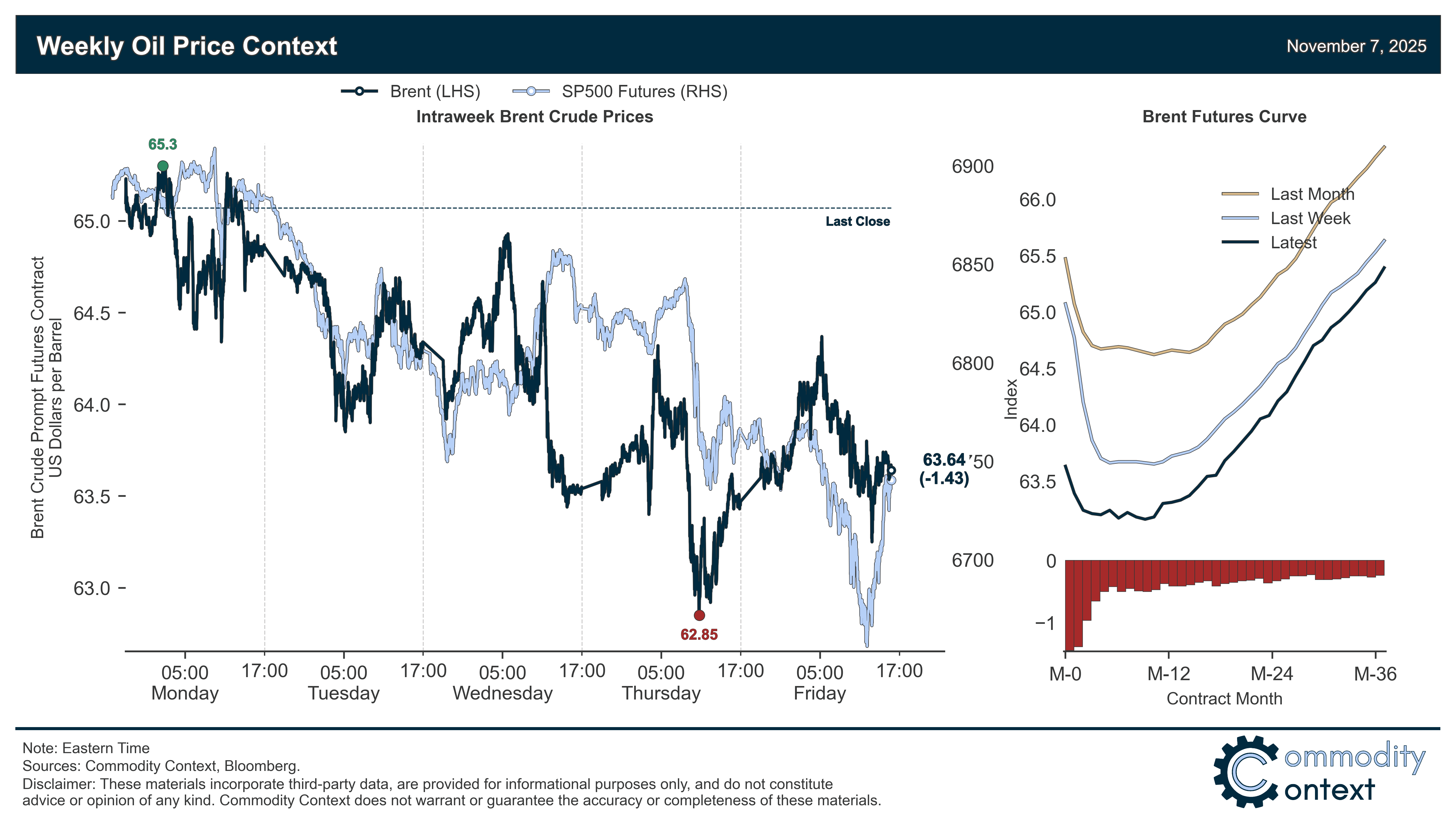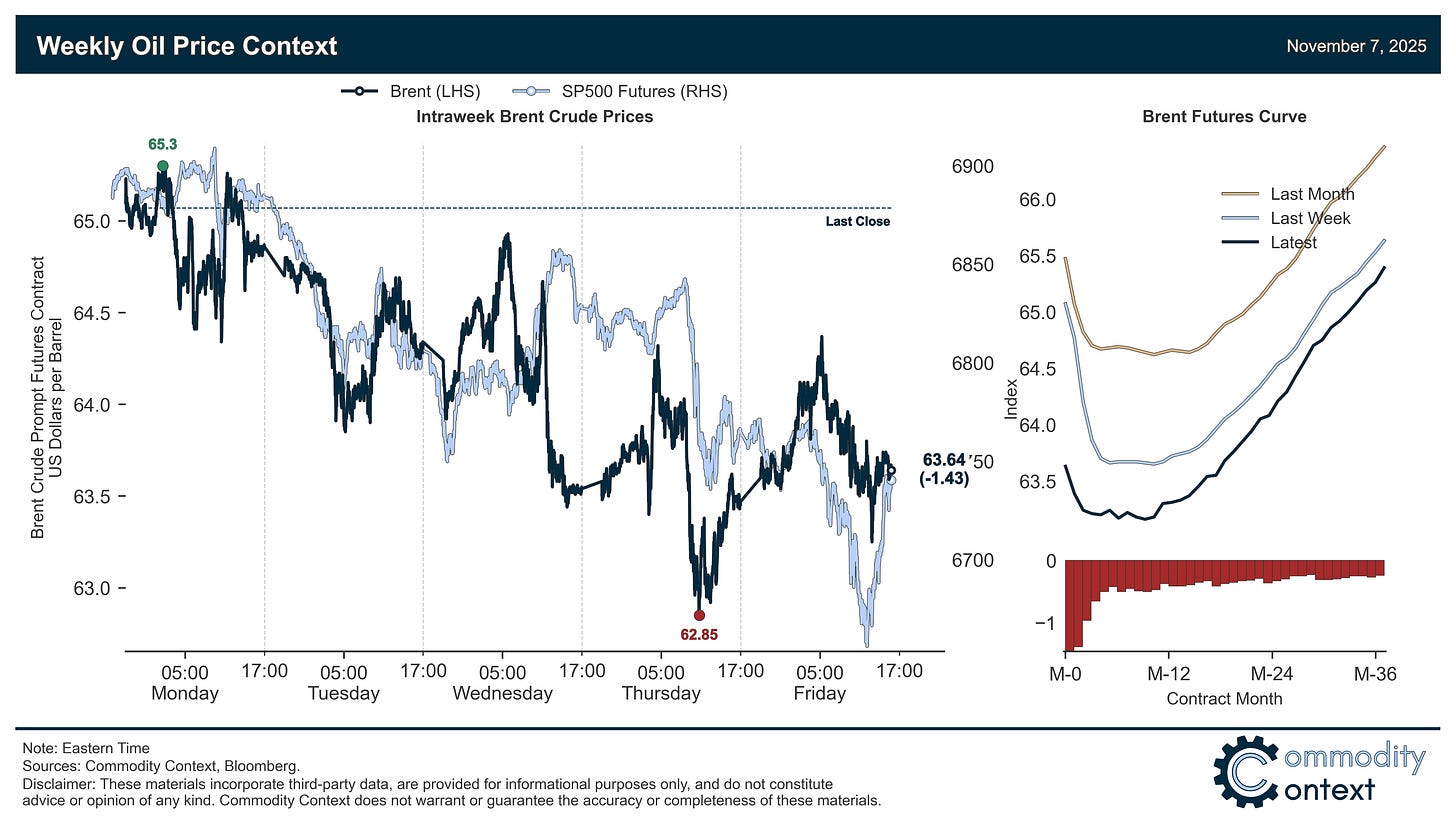 Flat Prices tumbled ~$1.50/bbl, with Brent ending the week below $64/bbl and WTI just below $60, straining under both fundamental pressure and caught in the pullback in broader risk assets.