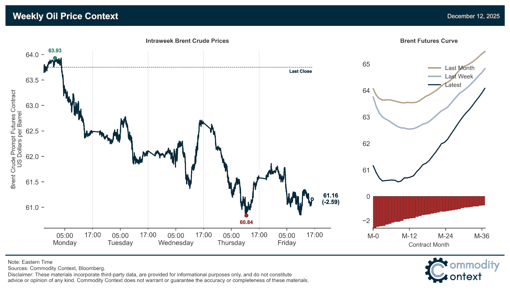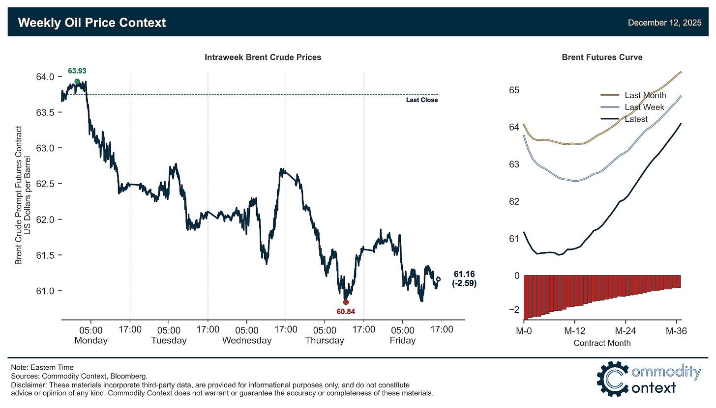Flat Prices fell roughly $2.50/bbl for Brent to close just above $61/bbl (<$1/bbl higher than year-to-date lows set in April) as the barrel continued to grind lower despite a never-ending series of flashy headline risks, punctuated, this week, by the US seizure of a shadow fleet tanker carrying Venezuelan crude.