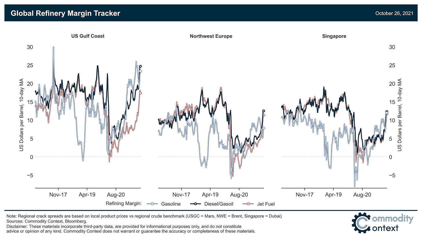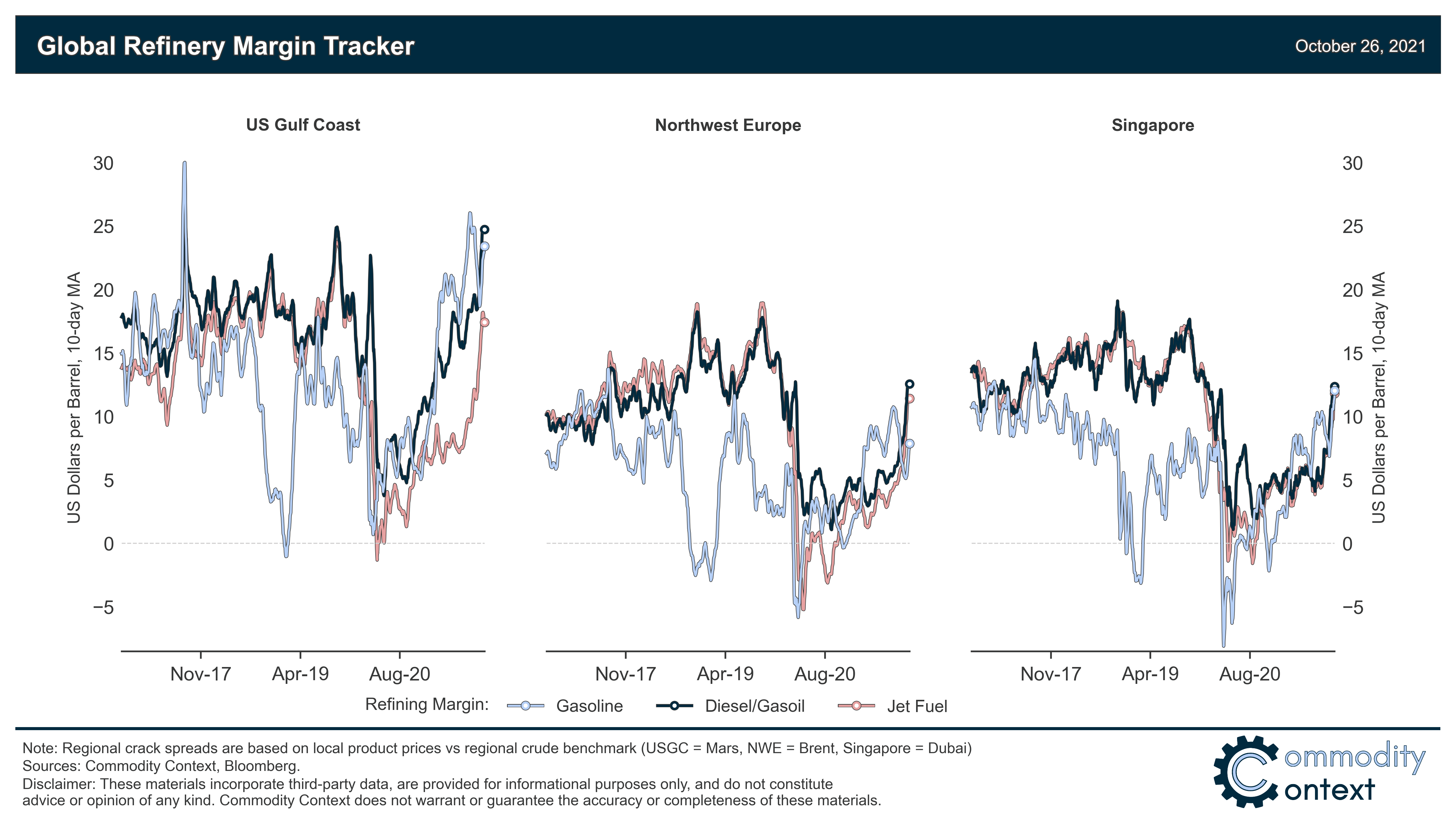 This sense of spot market tightness is exacerbated by the ongoing energy crises linked to tight natural gas, coal, and power markets across Europe and Asia. These multi-headed energy crises have the potential to contribute upwards of a million barrels per day of fuel switching demand, on top of the broadly bullish effect of the feeling of global scarcity on current sentiment. Demand has also continued to recover and, with the help of that aforementioned fuel switching, refining margins have roughly doubled from August levels, which further eases concerns about lingering weakness in end-product markets.