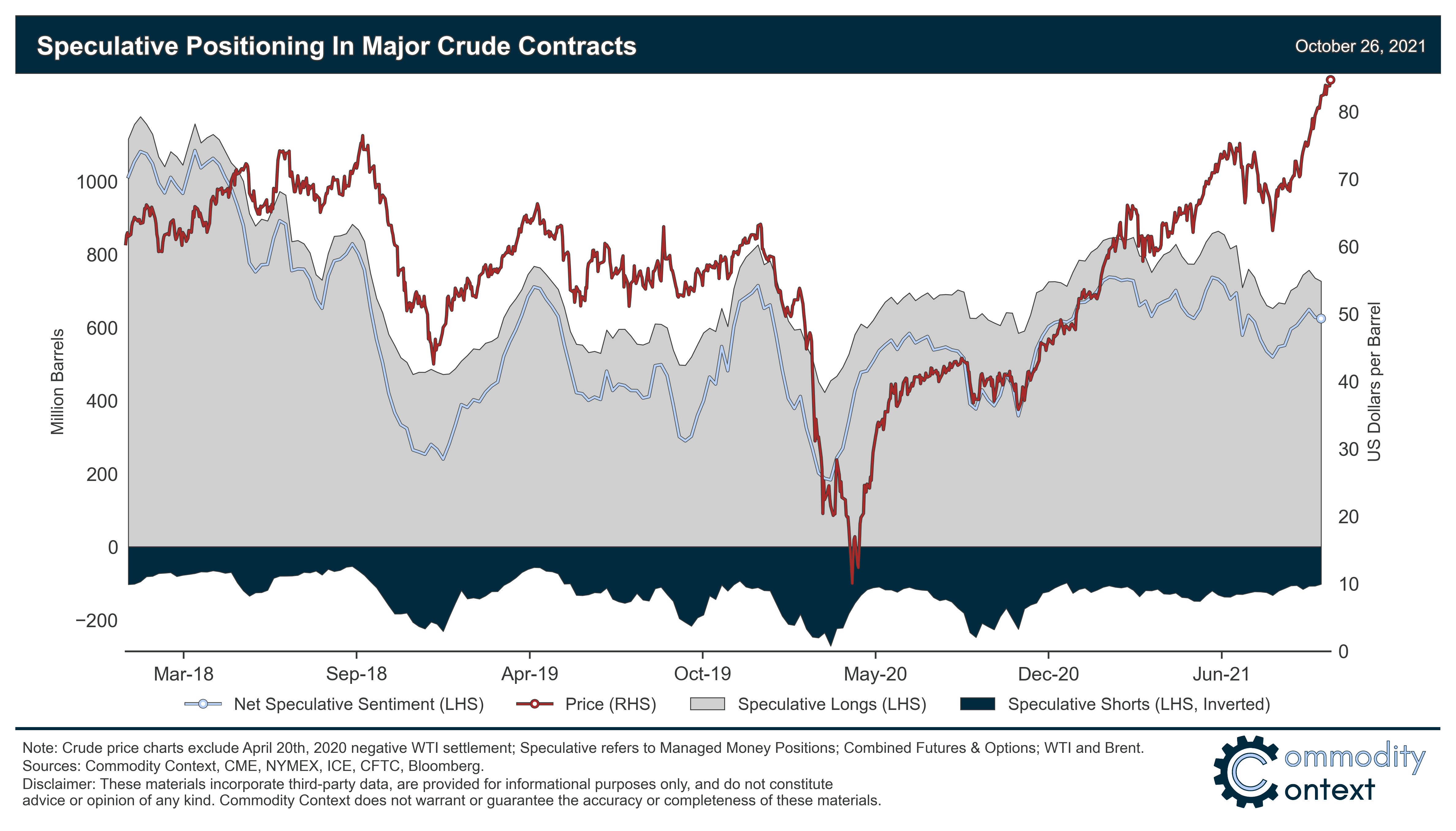 We still have room to go to hit the level of net length witnessed in late-June. This leaves fuel in the tank for further bursts higher; but it is also undeniable that we’ve re-entered a frothy sentiment environment in which the downside rationalization risk is ever present. In fact, it looks like net positions have already begun to roll over from the latest cycle high-water mark left at the beginning of October. The fact that crude prices haven’t collapsed outright is a positive sign of the market’s current resilience.