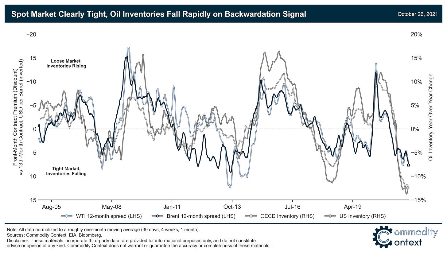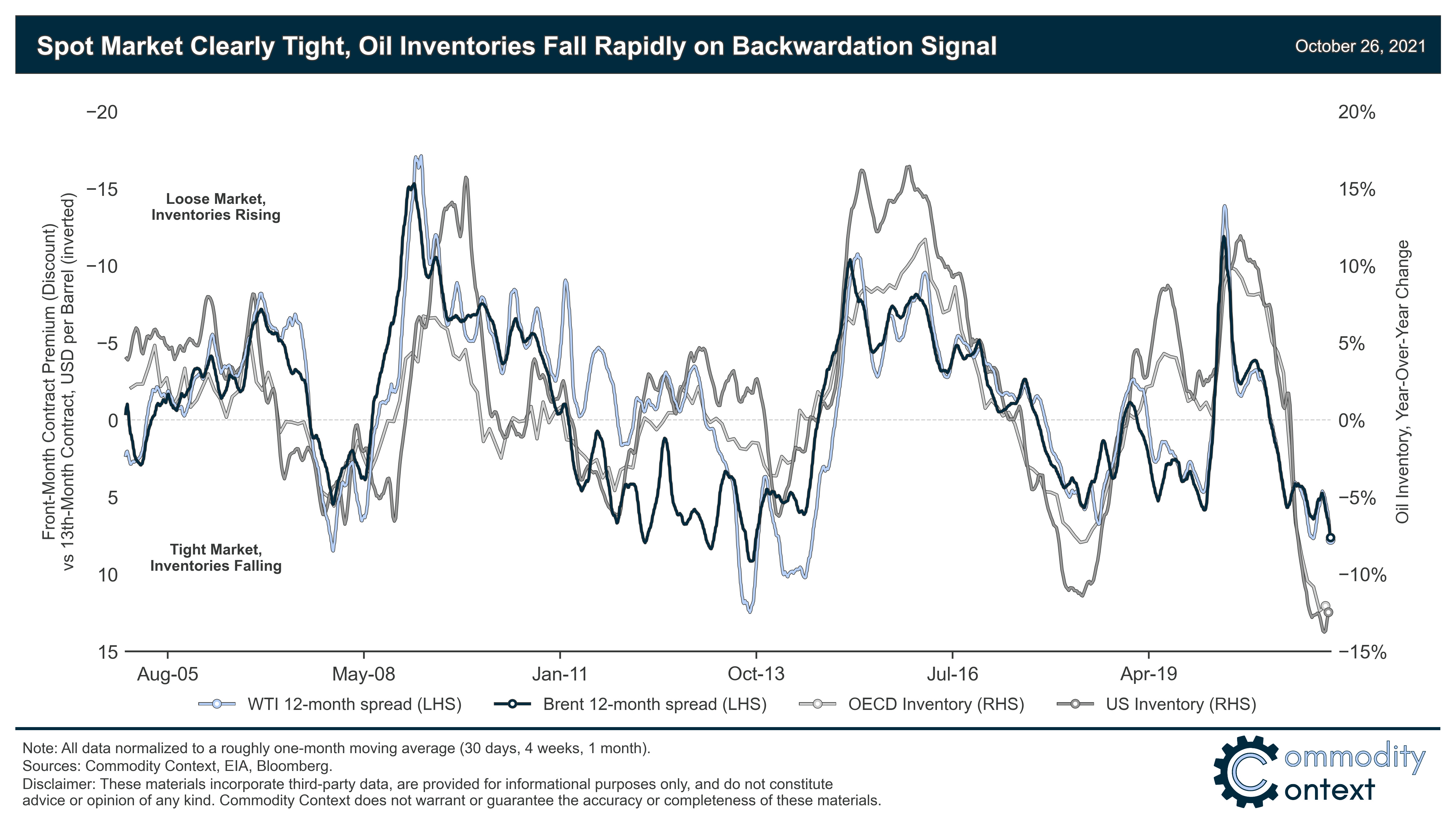 The acute backwardation facing crude markets today remains the strongest signal of insufficiency-supplied markets, and inventories continue to draw down rapidly around the world. In fact, OECD commercial crude inventories fell by a record 400+ million barrels since August 2020, more than erasing the pandemic-induced inventory glut. This drawdown rate is matched only by the scale of inventory builds during the cycle that tanked oil prices between 2014 and 2016.