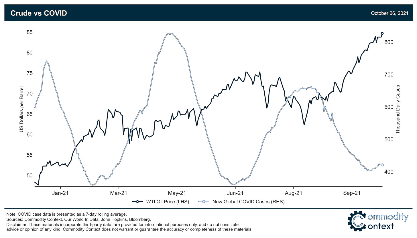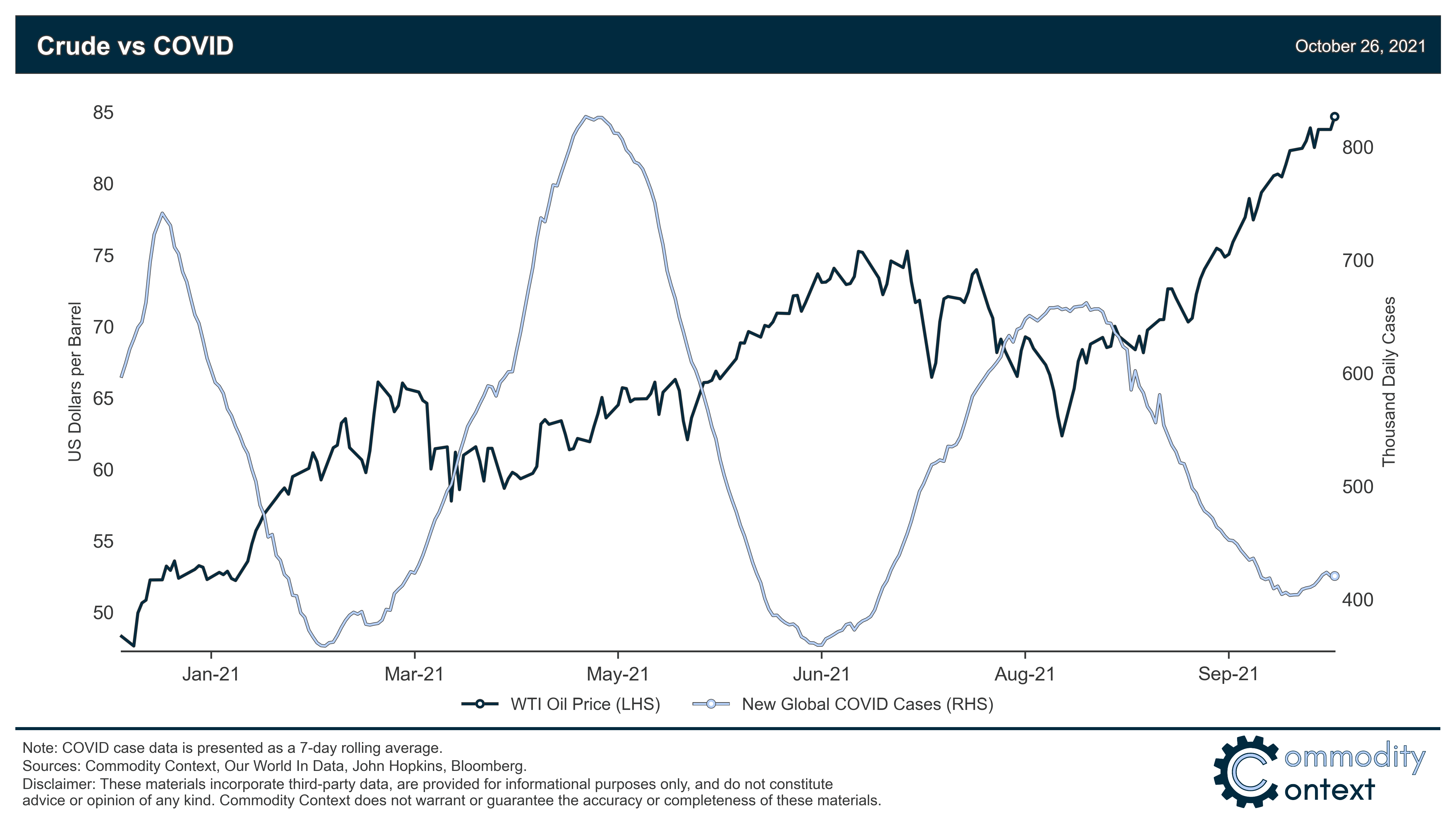 See, the rally that took us to the highs of late-June was driven in part by rising risk appetite amidst falling global COVID cases. Then around the end of June, global COVID cases began to rise again, which coincided with a $13/bbl drop in the price of crude through mid-August. The high point of global cases marked the low point for crude prices in mid-August, after which both trends reversed with global case counts falling and crude rallying to set new pandemic-era highs above $85/bbl.
