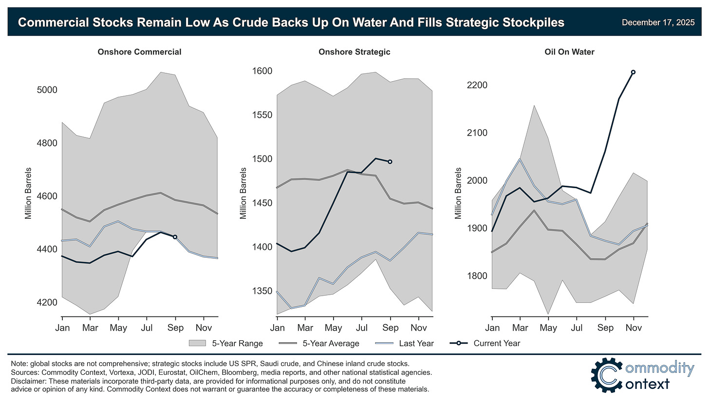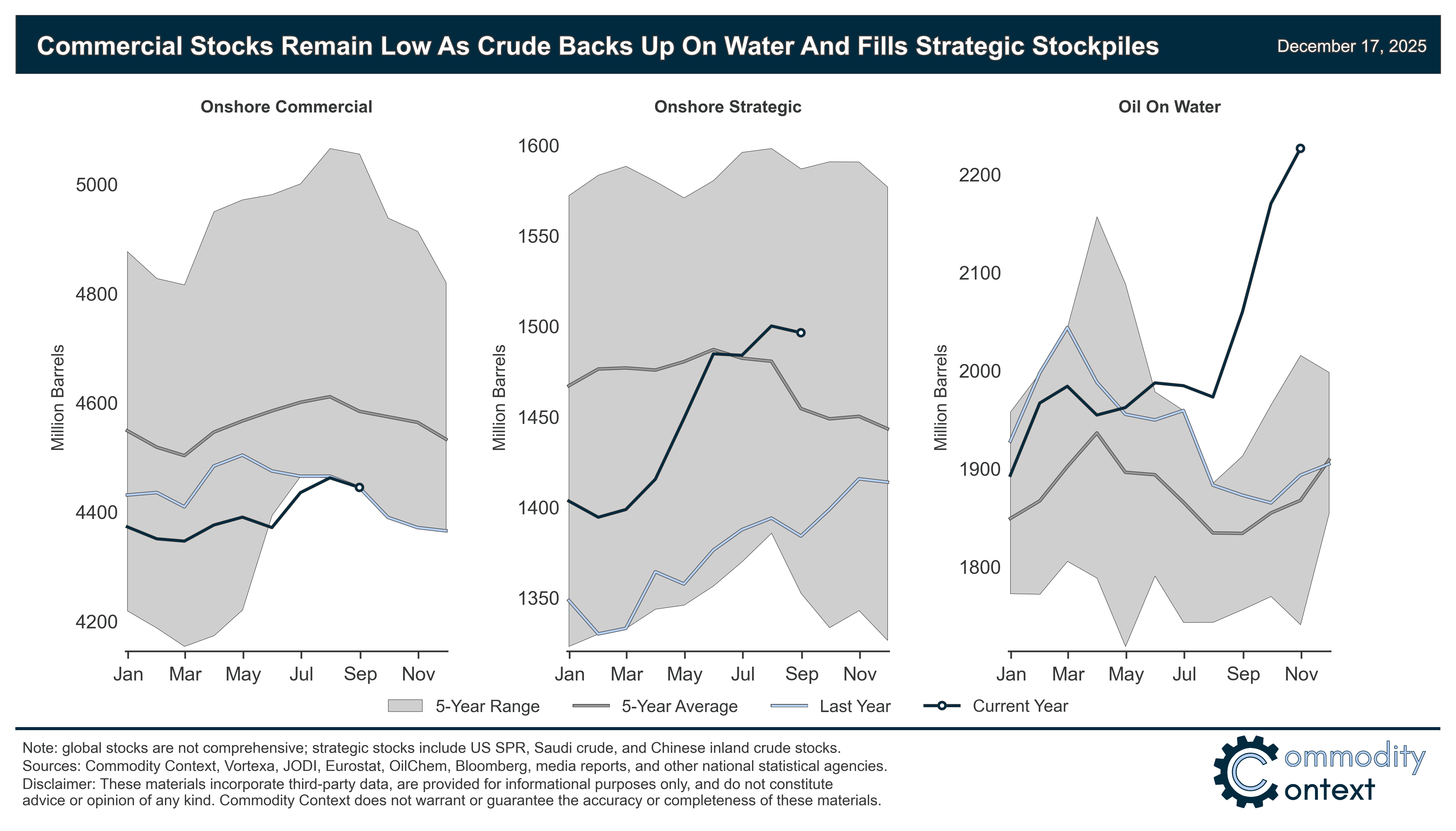 Despite ever-worsening outlooks for a forthcoming supply glut, oil markets have remained tighter than expected through the end of 2025. While we’re heading into 2026 with crude prices under pressure and the majority of the futures curve in broad contango, the front of the curve remains in stubborn—albeit diminishing—backwardation and the most visible commercial stocks remain achingly low.