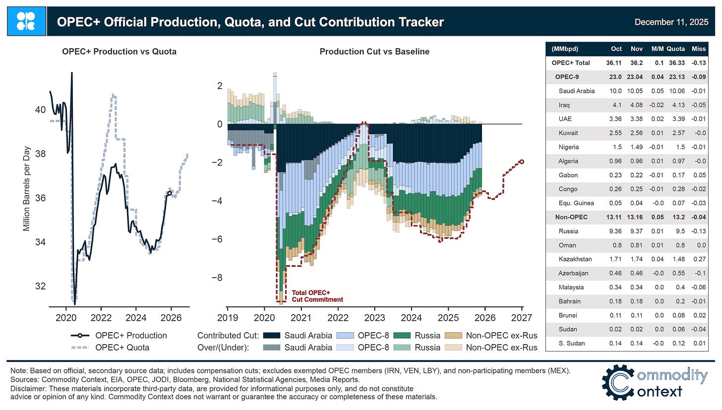 Below the paywall you will find the latest monthly edition of the Commodity Context OPEC+ Data Deck (50-page PDF), tracking groupwide and member-level official production estimates, quotas, compliance, exports, and official production data reconciliation vs output implied by visible movements.