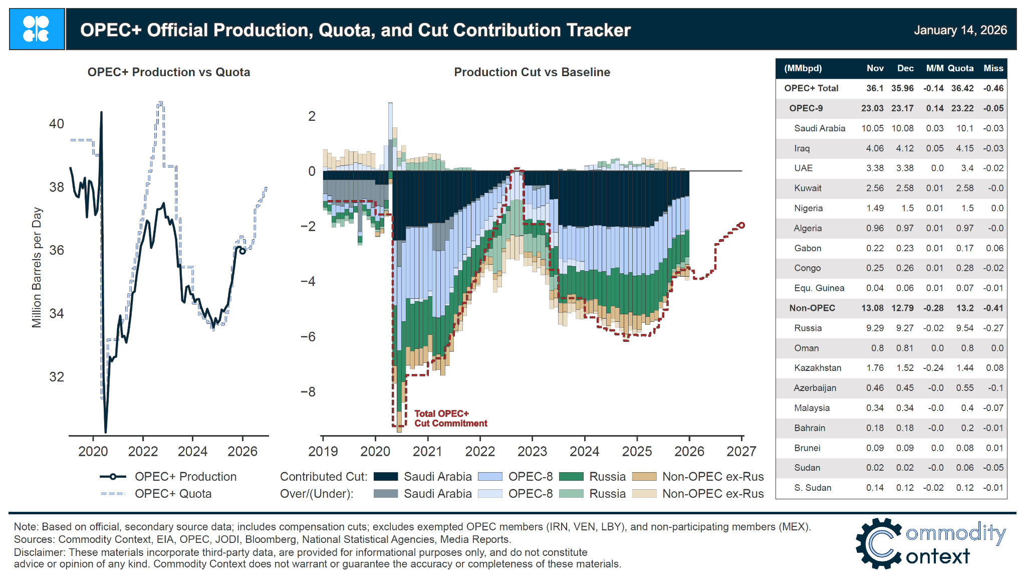 Below the paywall you will find the latest monthly edition of the Commodity Context OPEC+ Data Deck (50-page PDF), tracking groupwide and member-level official production estimates, quotas, compliance, exports, and official production data reconciliation vs output implied by visible movements.
