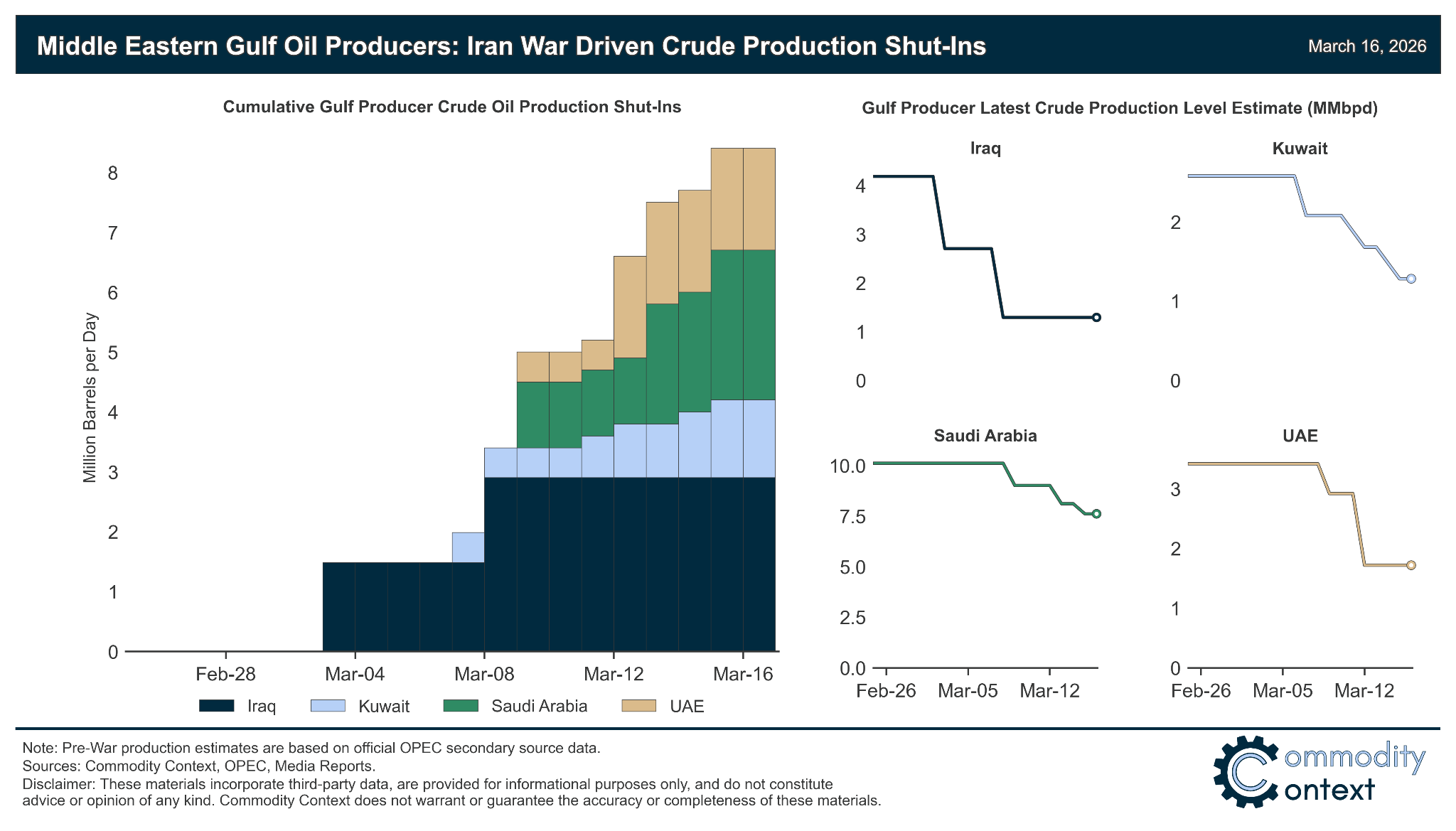 Where the producer group stood heading into the most severe supply crisis in its history, as well as early estimates regarding where the core of OPEC's Gulf production base currently stands today.