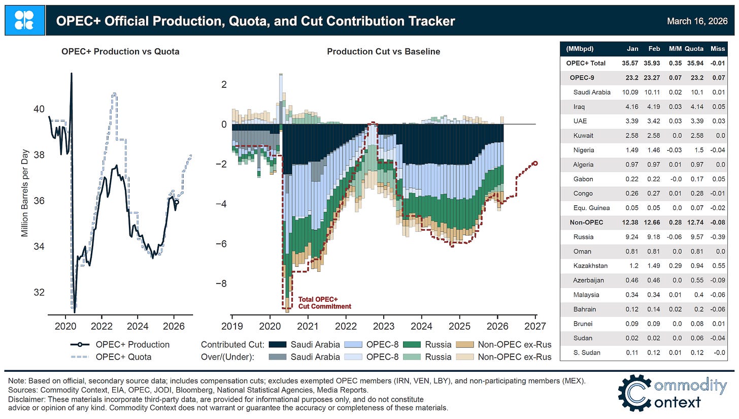 Below the paywall you will find the latest monthly edition of the Commodity Context OPEC+ Data Deck (50-page PDF), tracking groupwide and member-level official production estimates, quotas, compliance, exports, and official production data reconciliation vs output implied by visible movements.