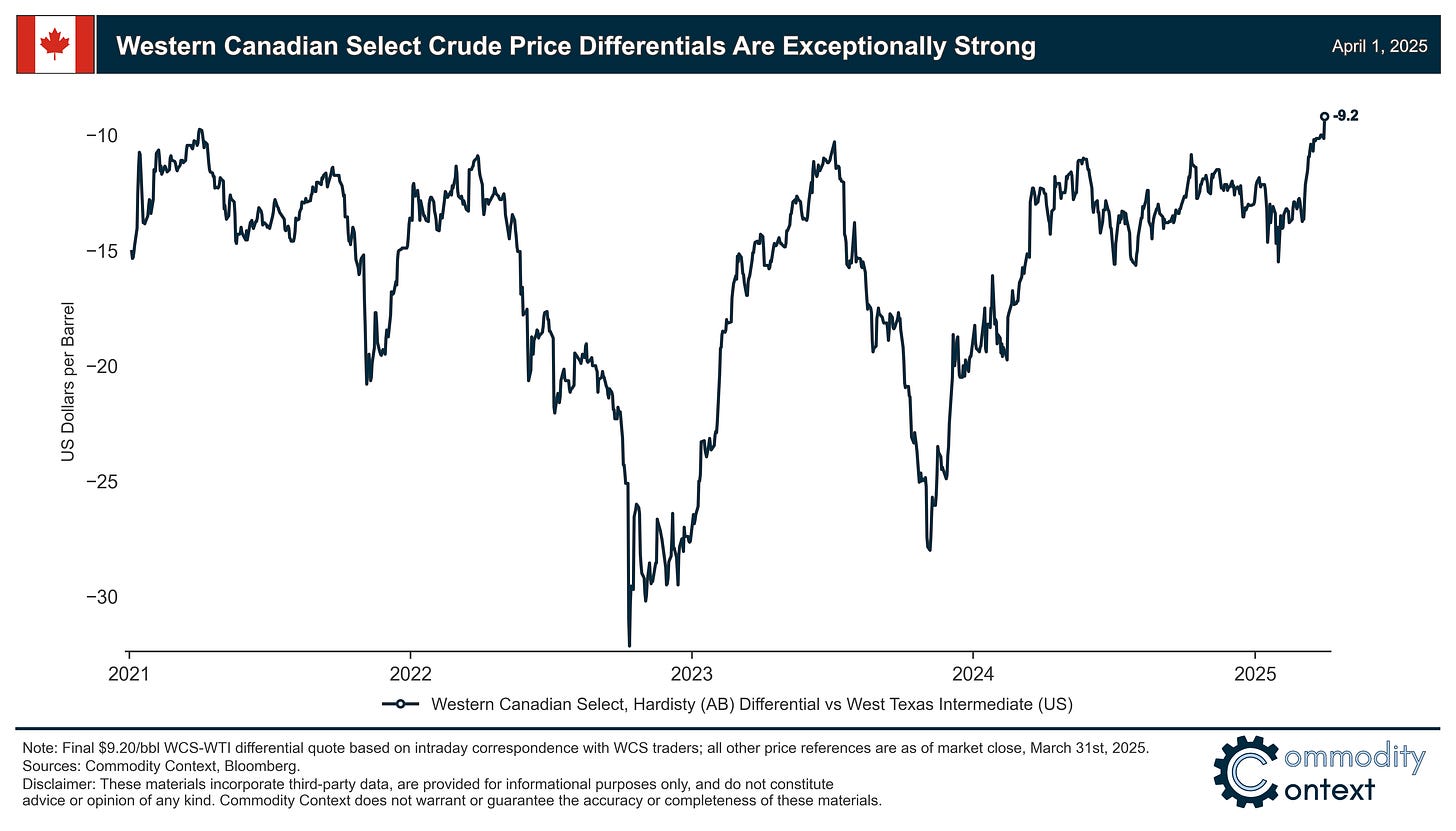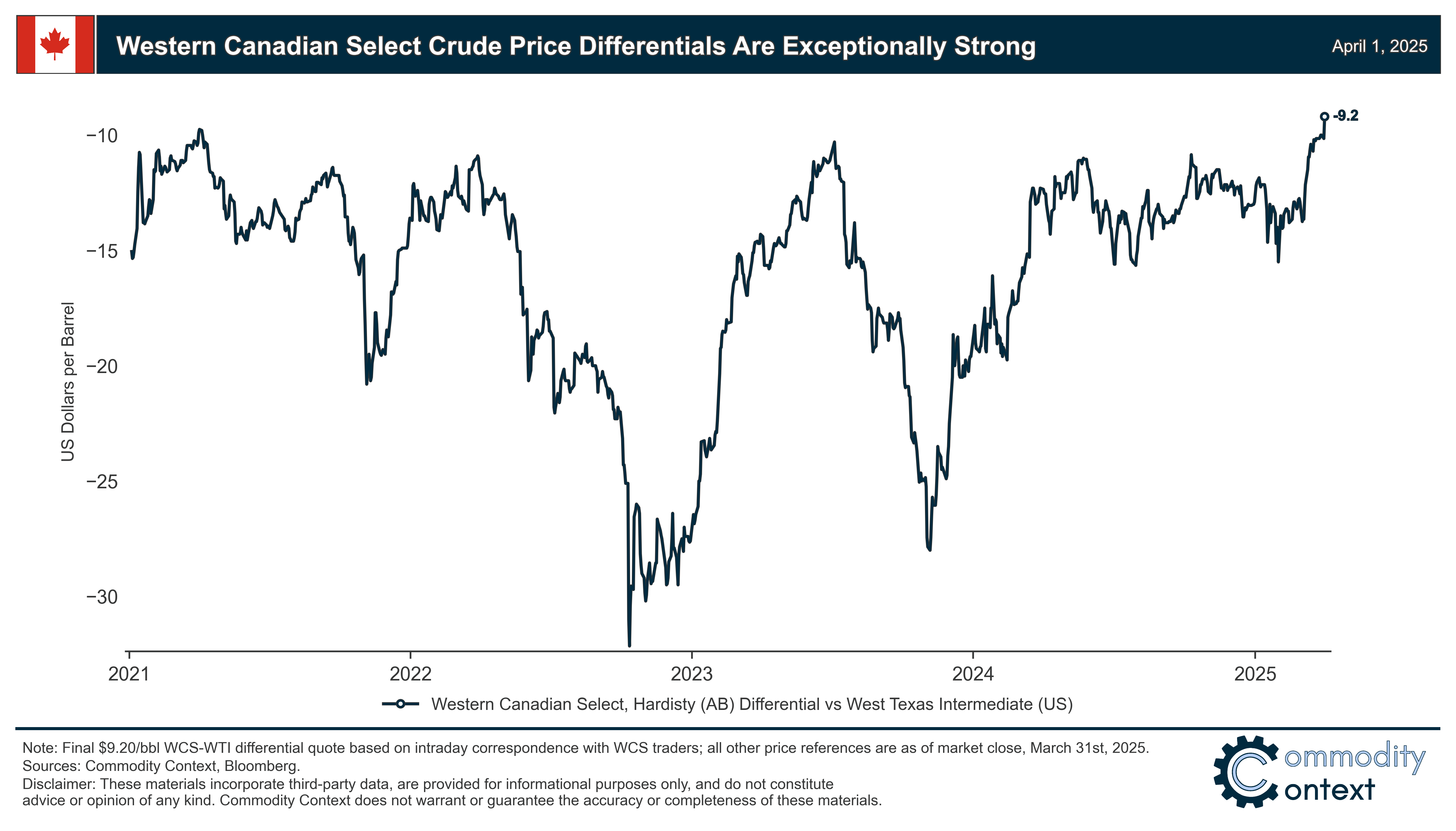 The near elimination of tariff-related discounting as threat of US tariffs has diminished, after weighing on the WCS differential to the tune of $4–$5/bbl between late-January through early-March.