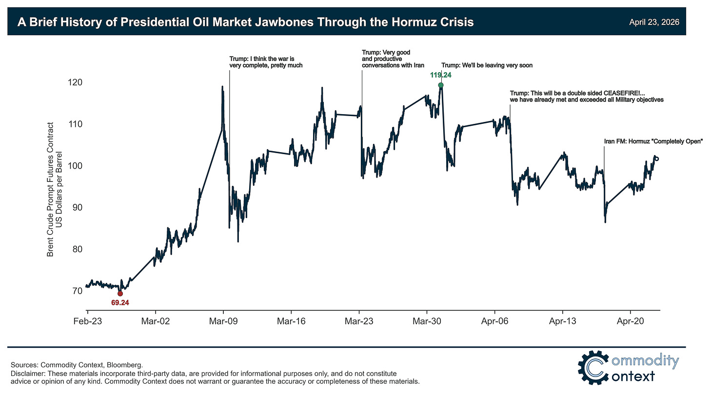 The largest pullback in prices occurred after the ceasefire announcement on April 7th; there is no doubt that the ceasefire has reduced, for now, the threat of extreme escalation, including more catastrophic damage to regional production infrastructure, but it has also thus far failed to end the conflict or reopen the Strait.
