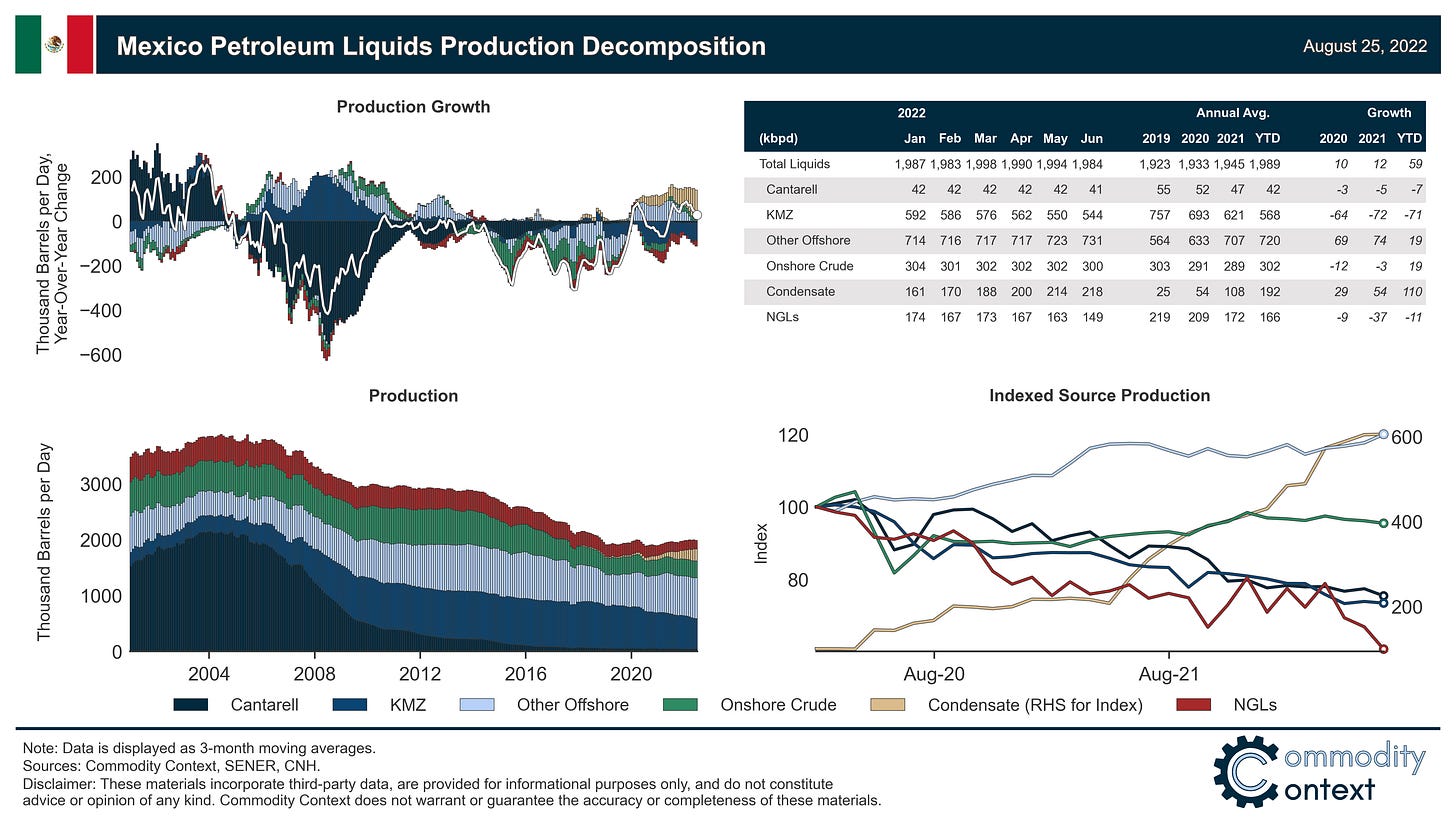 Natural gas liquids output—an area for growth for its northern neighbours—has also collapsed alongside falling domestic natural gas production, further hampering total liquids supplies and kneecapping the domestic petrochemicals sector.