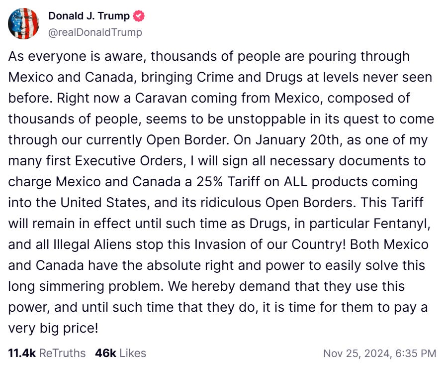 This week has yielded a flurry of media and client inquiries regarding president-elect Trump’s threats of 25% tariffs against imports of Canadian and Mexican goods, including oil, and I wanted to put the current state of my evolving thinking on this novel market risk in one place for readers.