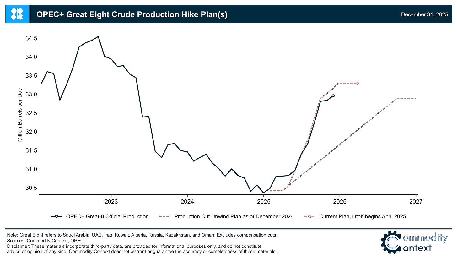 2025 was, of course, a year defined by Donald Trump’s return to the White House but no one could have quite expected the ensuing cacophony of tariffs, sanctions, geopolitical shocks, OPEC+’s about face, and Chinese strategic stock building that came to dominate headlines. This year’s market weirdness is most representatively crystalized in the smiley-faced futures curve—a year that can be best described as waiting, Waiting for the Glut. The overwhelming consensus view was that the combination of meagre demand growth, impressive supply growth in the Americas, and a rapid unwind of OPEC+ production cuts would precipitate a monumental supply glut of 3-4+ MMbpd in 2026 (assuming OPEC+ kept 2026 production unchanged from current levels). While a supply surplus accumulated rapidly through the second half of the year in analyst balance estimates (ours included), the effect on price was comparatively muted thanks to the “surplus sinks” of China’s SPR and sanctioned crude on water (read Oil’s Off-Balance-Sheet-Glut).
